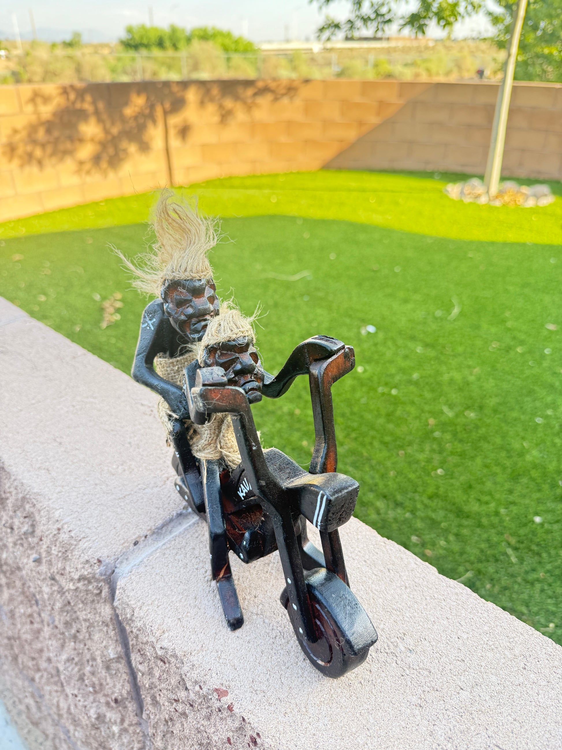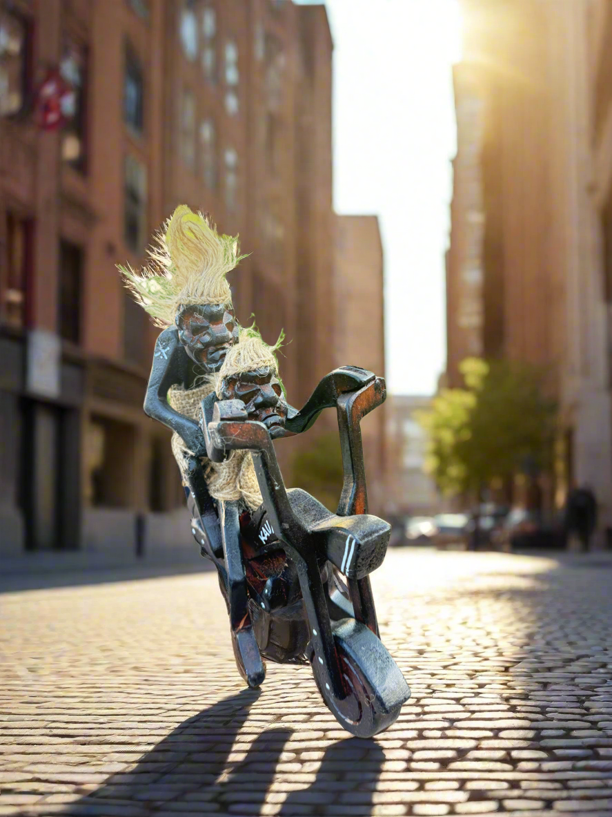 "The Hand Carved Burlap Hair Double Motorcycle rider measures approximately 8 inches in length, 7 inches in height, and 4 inches in width. Crafted with intricate detail, this piece is a unique addition to any collection."