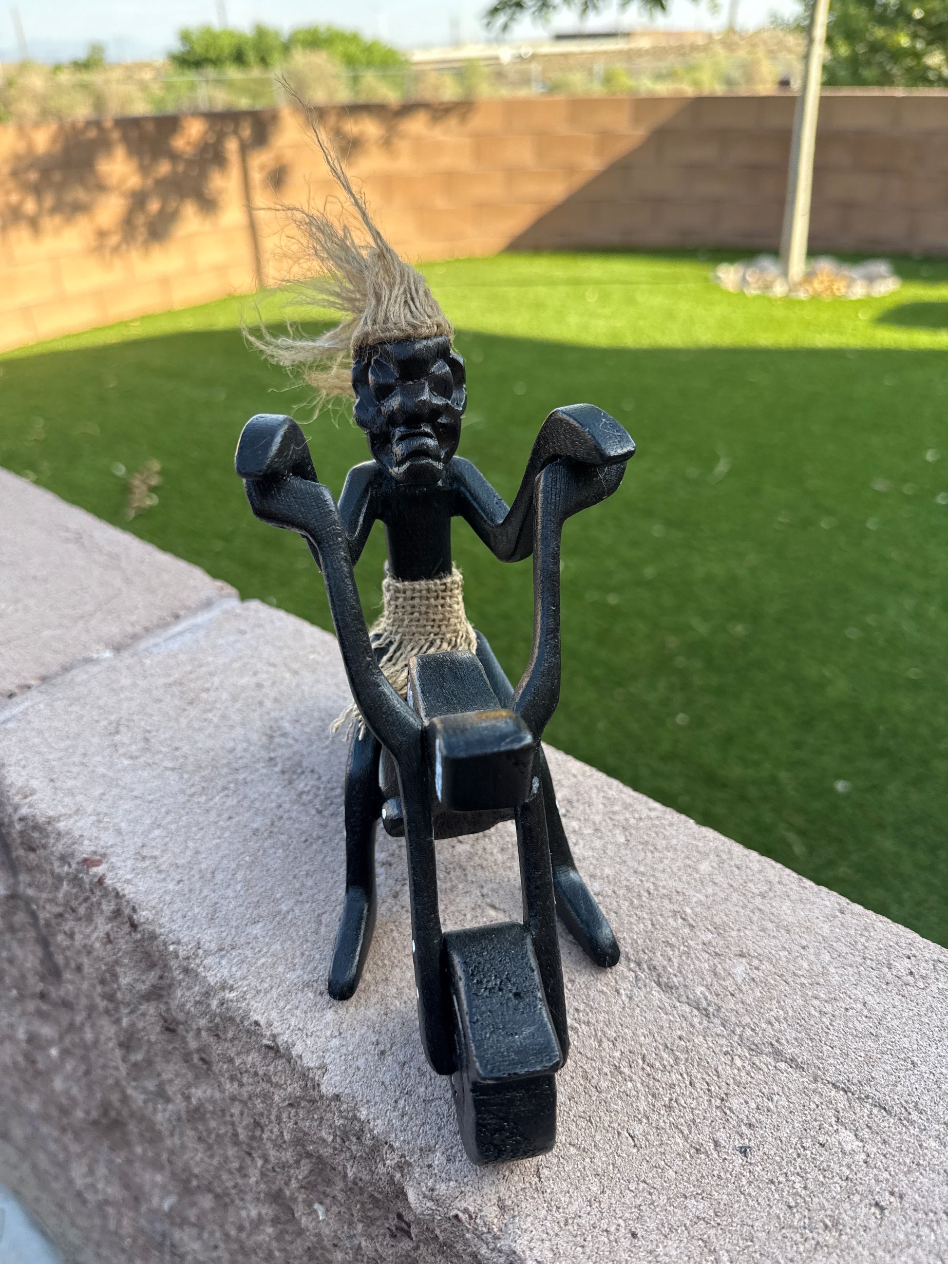 Unleash your inner biker babe with this Hand Carved Burlap Hair Single Motorcycle rider, measuring in at a compact and cool 8.5 inches long, 7 inches high, and 4 inches wide. Go ahead and rev your engines, this one's gonna be a wild ride!