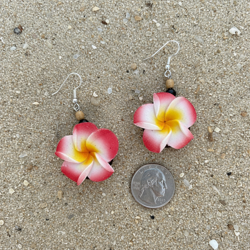 Outer hoop is approximately 2" diameter (5cm). Foam plumeria is approximately 1.25" (3.5cm) mounted on 1" (3cm) diameter wood disc. They come in different choices of colors: Green, yellow, pink, and purple.